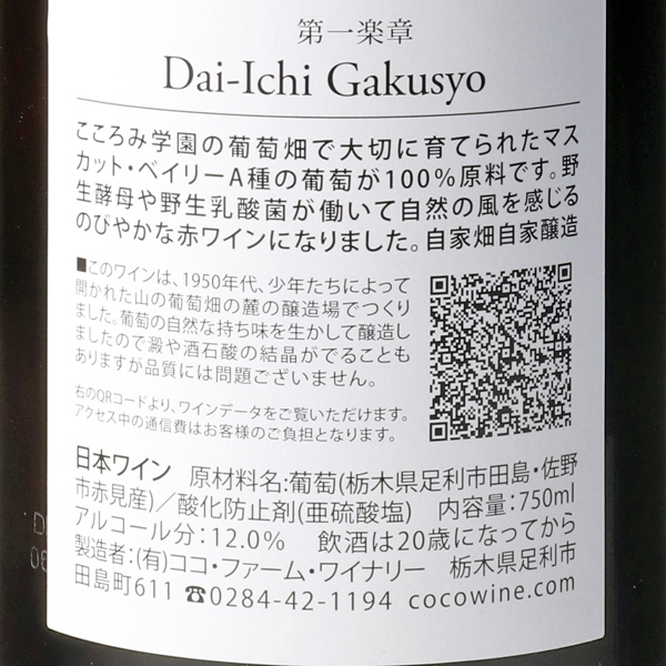 第一楽章は20世紀初頭の著名な葡萄栽培家川上善兵衛氏によって発展したマスカット・ベーリーA種による赤ワインです。真に個性豊かなワインとするため、伝統的なヨーロッパの技術を取り入れ、綿密な土地選び、非常な手間をかける農作業、そして手作業によるワイン造りを行われています。製造過程において清澄・フィルター処理を一切行なっていません。熟した果実の味わいと複雑さを持つ自然のままのワインに仕上げるために、人為的に手を加えることを最小限に抑えて瓶詰めされています。その結果、ワインはやや曇ったままで熟成とともにオリが沈殿します。開栓する数時間前にボトルを立て、オリを沈めてからお楽しみください。