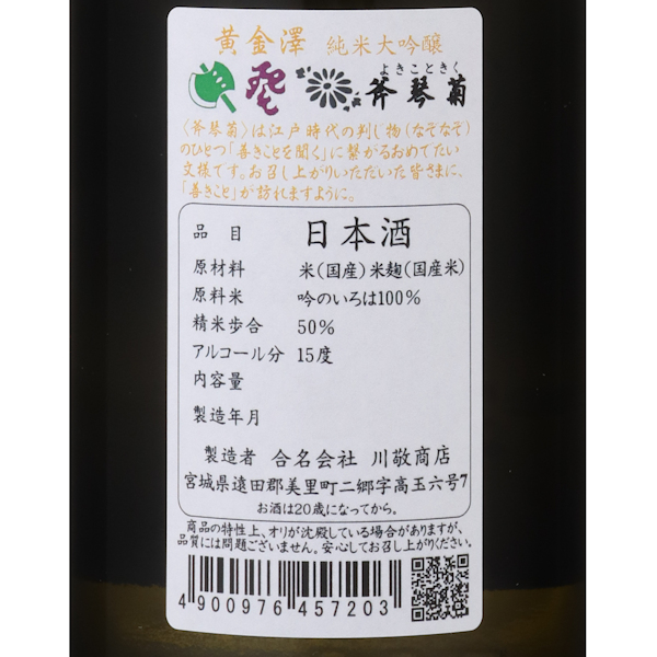 今期は宮城県産の「吟のいろは」を初めて扁平精米し、金沢酵母で醸しています。シャインマスカットを思わせる爽やかな香りとのみ口、やわらかな甘さと果実を頬張ったような瑞々しさ、シャープなキレが絶妙なバランスに仕上がったお酒です。ラベルのこの3つの絵で「よきこときく」と読みます。江戸時代の謎染めで、斧・琴・菊の模様を染めて、「善き事を聞く」という意味を示す縁起の良い絵柄です。日本酒をとおして皆さんに沢山の「善きこと」がありますように、という蔵元・醸造責任者の川名由倫さんの思いが込められた素敵な1本です。蔵紹介