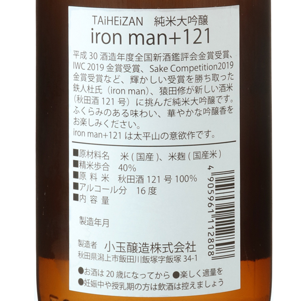 国内外の様々なコンクールで輝かしい受賞歴を誇る鉄人杜氏(iron man)猿田修氏。その猿田氏が新たに誕生した酒米、秋田酒121号で挑んだ純米大吟醸が登場しました。ふくらみのある味わいと華やかな吟醸香、鉄人杜氏、猿田修氏の意欲作です。蔵紹介