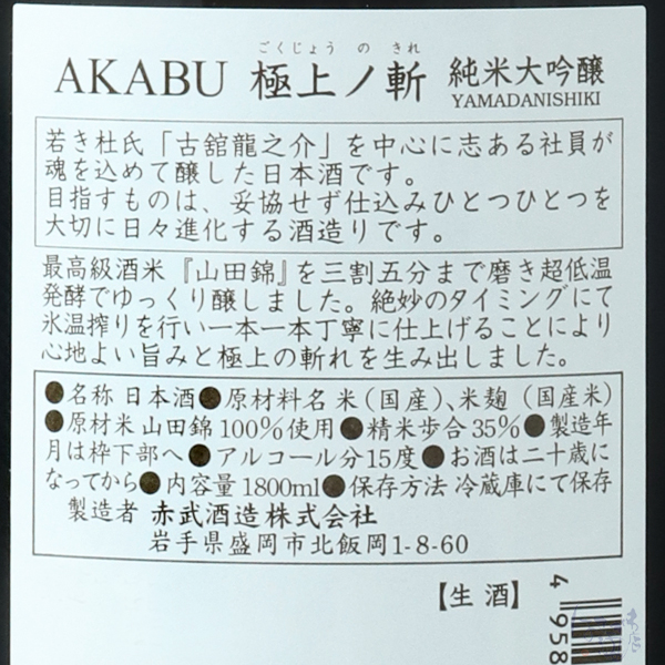 AKABUが目指す心地よい旨味と究極のキレを表現した「極上ノ斬」。華やかな果実香と優しい甘味。ジューシーで瑞々しい酸を感じます。味わいには伸びがあり、穏やかな余韻と共に綺麗に終盤に向かうキレが印象的です。山田錦35%精米を使用。注意事項