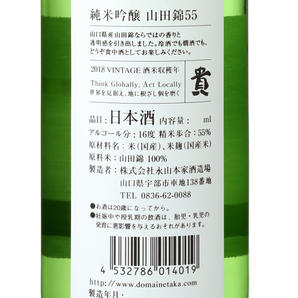 Terroir(テロワール)を求めて1888年(明治21年)山口県宇部市に創立。今の5代目、永山貴博氏が2002年に純米酒の可能性を追求する銘柄「貴」を立ち上げました。世界の醸造酒としてゆるぎない存在である、ワインの生産者から大いに感銘を受けた貴博氏は、地元で自らも稲作をしている二俣瀬の田んぼに対する敬意の念を抱いてゆきます。2019年には本格的に農業法人を設立し酒米づくりに取り組んでいます。ミネラル分豊富な仕込水の特性も活かした、クリアな旨辛口の味わいが人々の心を捉えています。