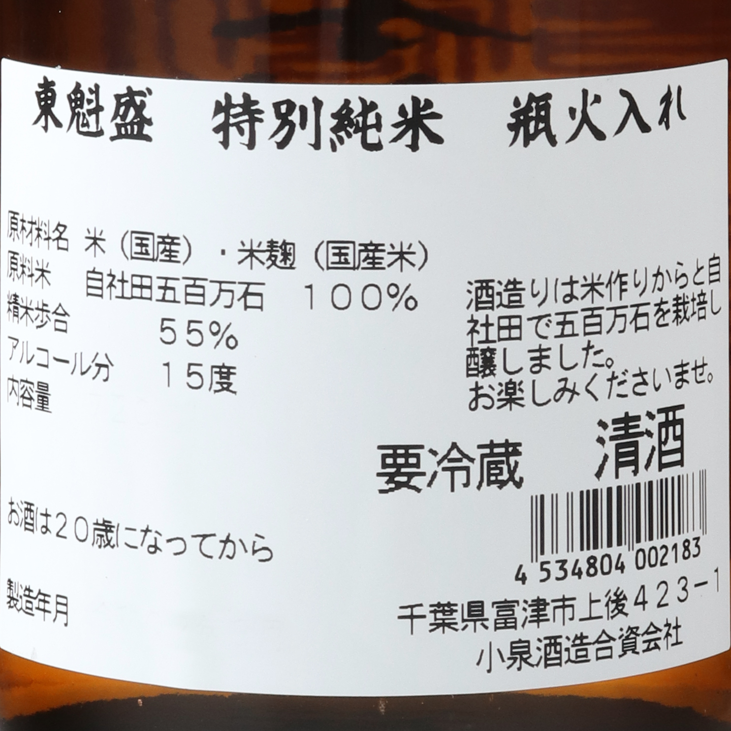 房総半島の伝統を守り、日々精進する蔵。寛政5年、1793年創業。千葉県の南部、千葉県富津市に蔵はあります。名字帯刀を許された小泉平蔵が、鹿野山の麓に位置したこの地に蔵を興しました。自社田で「五百万石」を育成しており、イノシシ、鹿、猿などの野生動物の被害と闘いながら酒米育成に積極的に取り組んでいます。代表銘柄「東魁盛」は華やかな香り系の吟醸酒からじっくり自宅で楽しめる純米酒まで、その味わいは非常に幅広いです。近年メキメキと腕を上げている蔵です。是非この機会にお試しあれ。