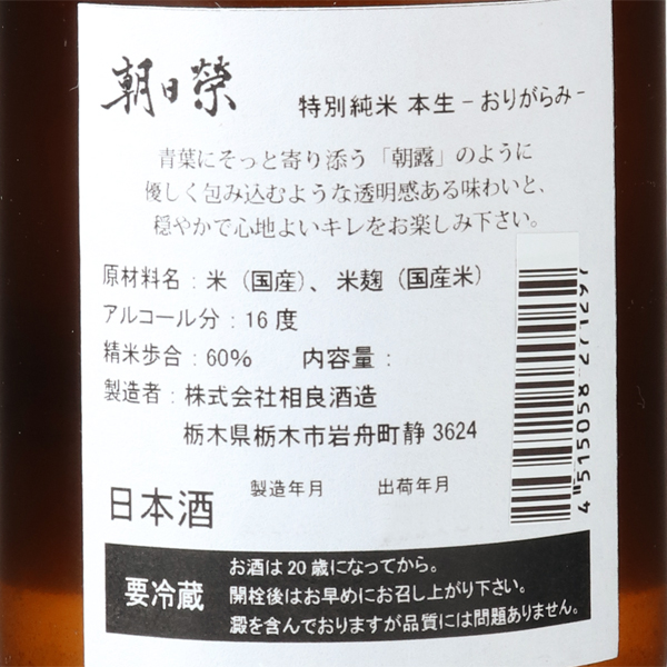 朝日榮は朝もやの中を昇る清澄な朝日のように、喜びと繁栄を願い名付けられました。その朝日榮の由来である朝もやをイメージしたおりがらみです。栃木県産あさひの夢を60%精米し、やわらかく透明感のある味わいと、優しく上品なキレのある味わいを表現しています。蔵紹介