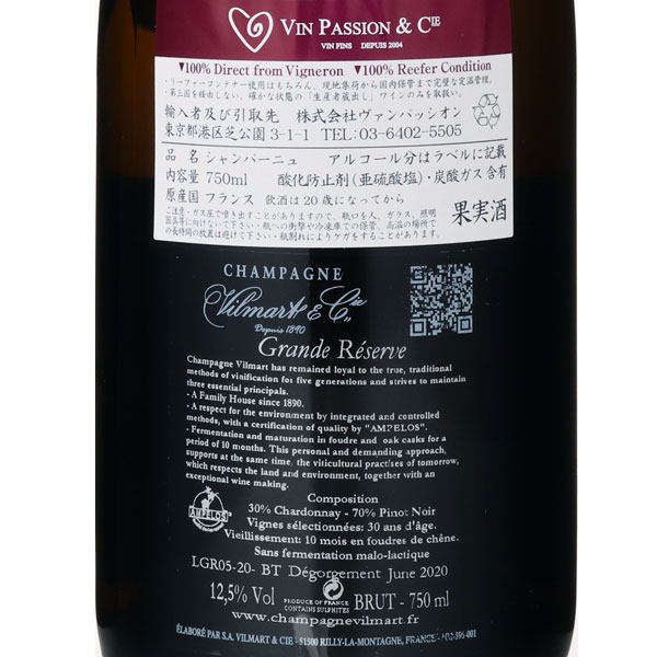 リリー・ラ・モンターニュで1890年の創業以来「テロワールの敬意」という理念を守り続けるヴィルマール。1990年より若き当主、ローラン・ヴィルマールが伝統を継承しています。11haの畑から年間約7001ケースのみリリースされています。除草剤、化学薬品を一切使用しないビオロジックによる栽培と、徹底した収量制限を施されたブドウのポテンシャルは驚愕に値します。ヴィルマールの特徴が「同家伝統の木樽発酵、樽熟成」。クリュッグやジャック・セロスといった名立たる生産者のみが時に取り入れる樽。ノンヴィンテージは全てフードルで、ヴィンテージはバリックで熟成します。その技は飲めば納得の見事さです。