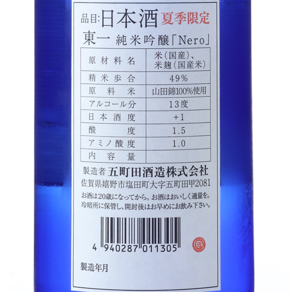 今や日本酒のトレンドの一つとなった低アルコール原酒の先駆けである「東一 Nero(ネロ)」のSummerバージョン、通称「夏ネロ」。現代の食事スタイルに合わせ、ワインと同じアルコール度数に抑えながら、山田錦ならではの米のふくよかな旨味を引き出す、独自の方法で醸されました。落ち着いた南国フルーツ様の香りと、軽やかながらしっかりとした旨味が調和しており爽やかな酸味がひき締めます。蔵紹介