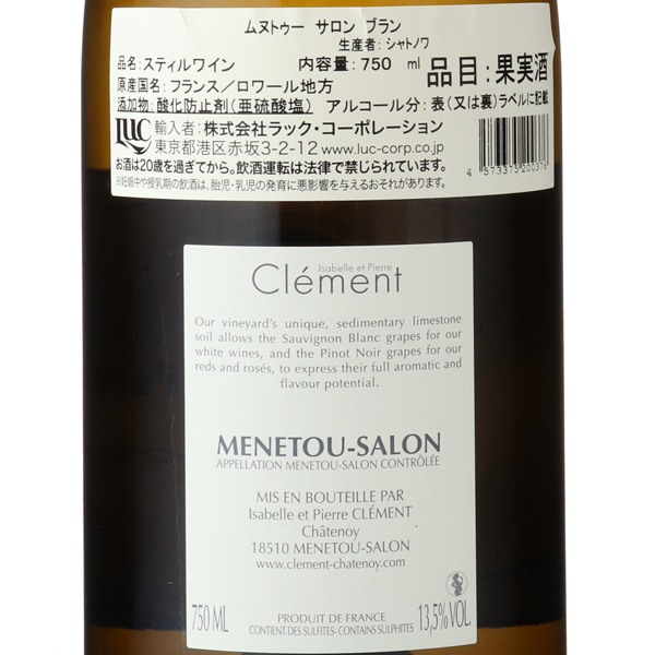 ムヌトゥー サロンはサンセールの西に隣接するアペラシオン。ポートランディアンの硬い石灰石やキメリジャンの泥灰土など石灰質豊富なテロワールをもち、ふたつの著名産地に比肩するワインを生み出す。サンセール同様、ソーヴィニヨンによる白とピノ・ノワールからなる赤、ロゼが認められています。このムヌトゥー サロンにおいて、1560年から続く由緒正しき醸造所がドメーヌ・ド・シャトノワ。クレマン家により代々守り継がれ、現当主は15代目にあたるピエール・クレマンと夫人のイザベルです。所有する60haのブドウ畑はキメリジャン土壌にあり、リュット・レゾネで栽培されています。品種は3分の2がソーヴィニヨン、3分の1がピノ・ノワール。2008年よりブドウの受け入れから瓶詰めまで、一切ポンプを使わず、重力の力のみで醸造行程の進む仕組みがとられています。