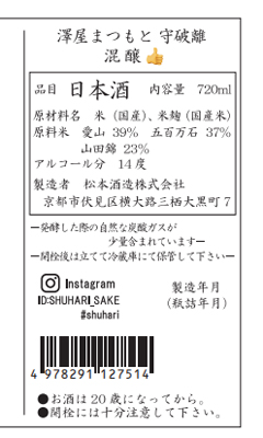 原料に勝る技術は無し!1791年創業。京都市伏見の歴史ある酒蔵で、赤レンガ蔵と八角形の煙突が印象的な酒造蔵は、近代化産業遺産に指定されています。澤屋まつもとのコンセプトは、守破離 (しゅはり) 。澤屋まつもとの伝統を守ること。伝統を破り、他で学んだことを実践すること。守と破を大切に、そこから離れて新たな価値観を見出すこと。京都の酒蔵として、京都の水、良質な米の旨みを表現。透明感、旨み、爽やかさ、シンプルな中に、エネルギーを感じられるお酒です。