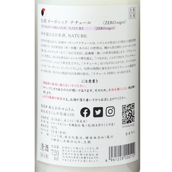 仙禽 nigori オーガニック・ナチュール 0(ゼロ) 生酒 *クール便のみ
