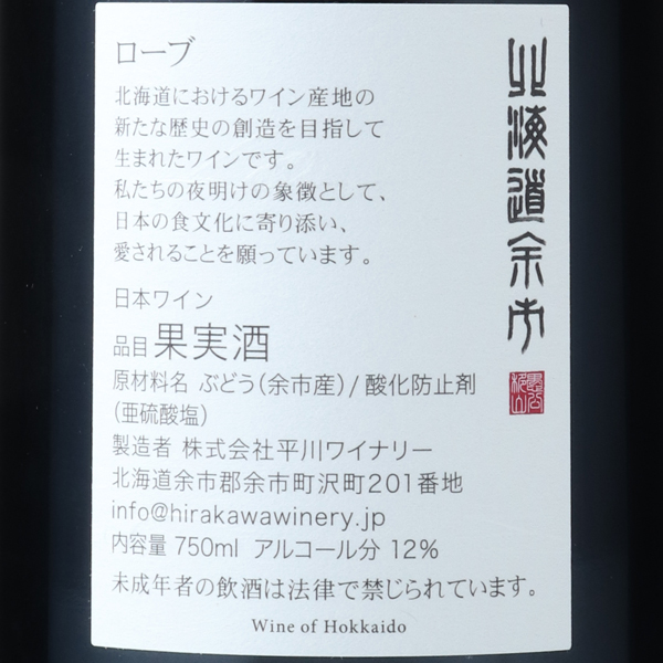 「ローブ」とは、フランス語で「夜明け」を意味します。寒冷産地における新たな赤ワインの創造を目指して名付けられました。平川ファーム最上部の区画で栽培された熟度の高いブドウを選りすぐり、手除梗にて選粒しました。44日間のマセラシオン、15ヶ月の樽熟成を経て生まれた赤ワインは、北海道の地で生まれたとは思えない濃い色調と豊かな果実香を持ち、厚みと質感、タンニンと酸味が一体感を持ちながら複雑に絡み合います。松茸のような香りと非常に艶のある華やかさ。ブルーベリーなどの黒系果実が穏やかで、複雑で丸みのある香りが広がります。このシルキーな質感はぜひブルゴーニュ型のグラスで、豊かな香りとソフトな質感を引き出してお楽しみください。温度は16~18度が理想的です。