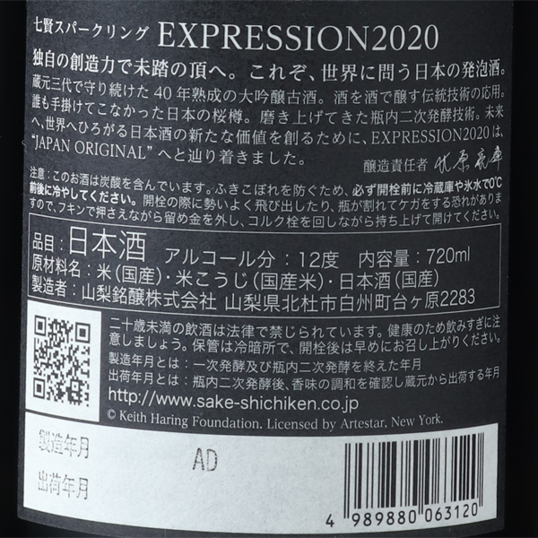 キース・へリング氏とのコラボレーション3年目の今年は、味わいもクオリティも集大成の年。七賢には200年前に建てられた文化蔵があります。そこで貯蔵されてきたのは蔵元三代にわたり守り継がれてきた大吟醸古酒。醸造家・北原亮庫氏はEXPRESSION 2020の創作にあたり、この希少な古酒に向き合いました。仕込み水のかわりに酒を使って酒を醸す日本酒の伝統製法。それを応用し、この古酒で発泡酒を醸そうと考えたのです。さらに、もうひとつのこだわりは国産桜樽での貯蔵熟成。オーク樽などの海外製ではなく、日本らしさにこだわり、国産の桜材を使った樽を新調して仕込んだのです。樽の中で日々変わりゆく40年熟成大吟醸古酒。長い年月を経て恋人たちが再会したかのように香りと味わいが手を取り合い、古酒の個性を桜樽が優しく包み込みます。瓶内で二次発酵させたその味わいは、まろやかに馴染む極めてシルキーな口当り。春の芽吹きにも似た旨味がゆっくりと開いていきます。蔵元三代40年の時を超えて、今この瞬間に新たなスパークリング日本酒が産声をあげました。容量:スパークリング 720ml / 40年熟成大吟醸古酒 150ml
