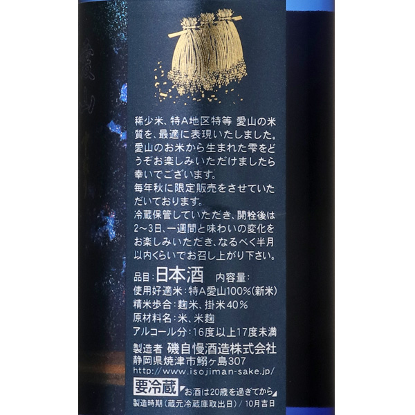 焼津が生んだ銘酒、世界レベルの評価と酒造り果実のような華やかな香りに奥深い味わいで大人気磯自慢酒造は1830年創業の老舗蔵。仕込み水の約70%は南アルプス白峰三山、間ノ岳を源泉とする大井川から、また、酒造りに最も大切な原料である酒米は全国各地の厳選した酒造好適米を使用しています。中でも多く使用している酒米が山田錦です。兵庫県東条産山田錦を田んぼの区画違いでそれぞれ醸すブルーボトルは、ワインの世界、AOC(ワイン産地の格付け)を日本酒に取り入れた試みです。