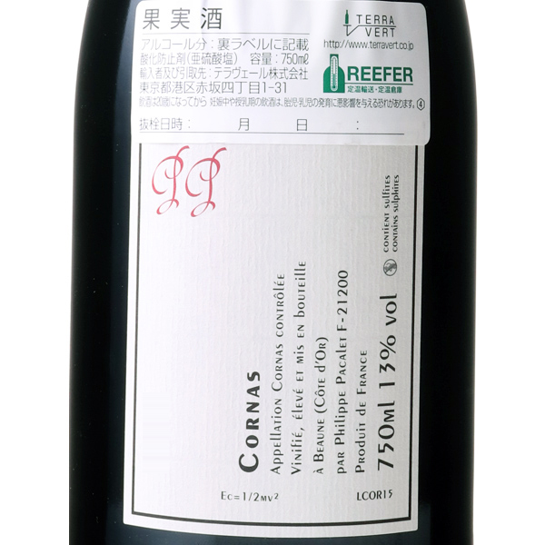 もともとフィリップパカレはブルゴーニュの生産者なのですが、エリアを飛び出し、他のエリアでも続々とワインをリリースをしています。今回はローヌエリアのコルナス。砂質の混じる花崗岩土壌に植わる平均樹齢25年ほどのシラーを用いて造られます。香りは黒系果実の印象にパカレらしく華やかでエレガントな印象が混じります。味わいはしっかりとした果実味がありながらも濃さはなく、綺麗な酸味、ミネラル感に支えられ、適度なタンニンで引き締まります。蔵紹介