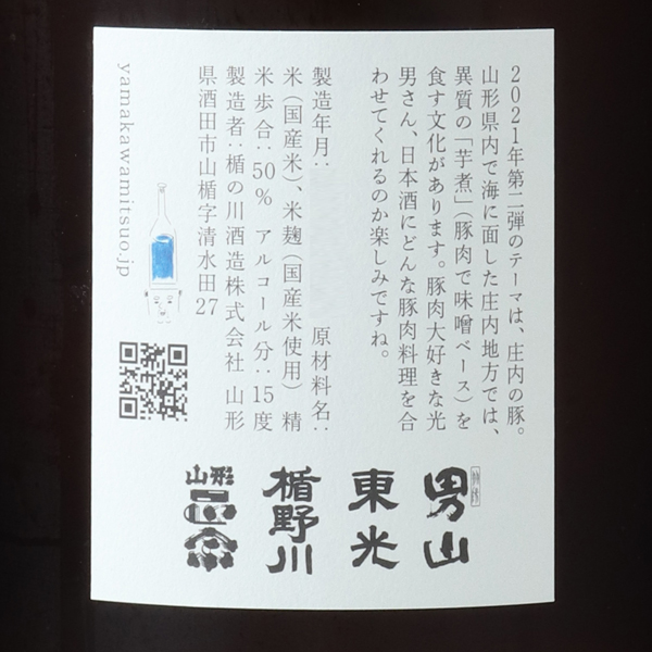 山川光男2021プロジェクト!テーマは「肉との遭遇」。 第二弾となる「2021 なつ」は、「庄内の豚」とのコラボレーションです。 豚肉の大好きな光男さんは、山形県酒田市の幻の豚とも呼ばれる「平田牧場 金華豚」に目を付けました。 どんなコラボレーションが待っているかお楽しみです!米を噛みしめるような豊かな旨味を上品な香りが引き立てる一本となっております。