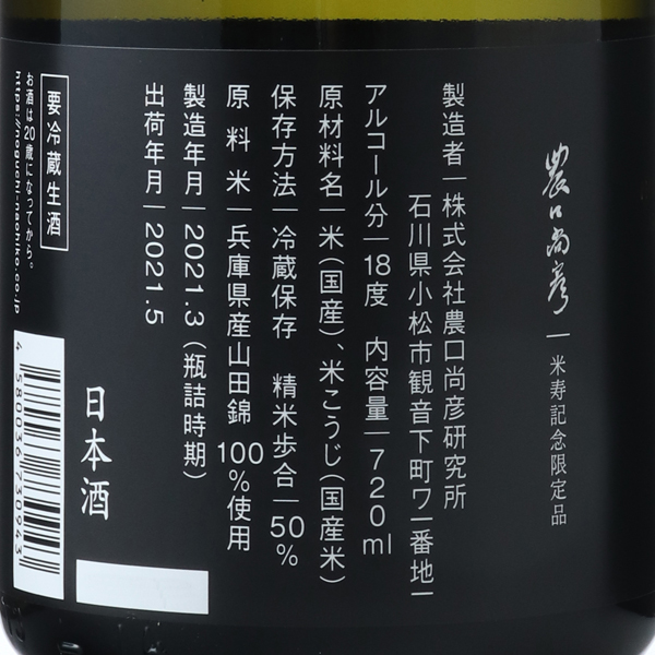 今期は、農口尚彦杜氏にとって「米寿」、88歳を迎えた特別な年になります。この記念すべき年に農口杜氏の「酒造りにかける想い」「次世代にかける想い」を形として残すため、今期醸したお酒の中から5種類を選定し、それぞれ888本限定で、5回に渡りリリース予定です。第一弾は兵庫県産山田錦を使用したお酒です。今回の第一弾ラベル上には、農口杜氏の言葉である『酒造りは、一生かけても「わかった」ということはない』が記載されており、シリーズ始まりの言葉となっております。