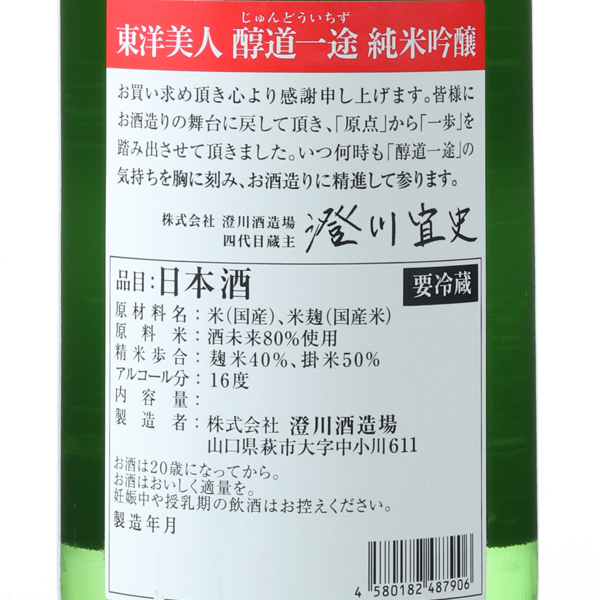 酒米違いでリリースしている「醇道一途」シリーズ。何があろうと今もこれからも酒造り一筋に生きていきなさい。と社長兼杜氏の澄川宜史氏が、初めて教えを請うた、灘の銘杜氏の米田杜氏に頂いた言葉が「醇道一途」です。醇道一途は澄川酒造場の中でも日本酒の美味しさ、お米による香りや味わいの違いを伝えることができる商品のひとつです。「十四代」の高木酒造が生み出した酒米「酒未来」で醸されています。東洋美人の澄川杜氏はかつて高木酒造で酒造りを学んだということもあり、思い入れのある酒米。キレのあるシャープな味わいでありつつ、爽やかな香りと軽快な口当たり、スッキリとした喉越しが、食欲を盛り上げてくれます。