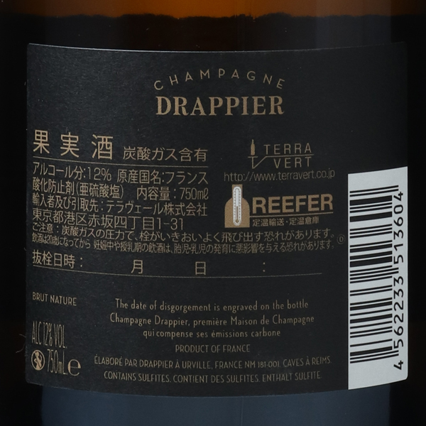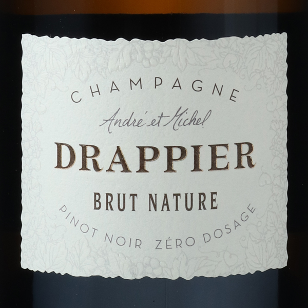 シャンパーニュ髄一の自然派。1989年から農薬を使用せずに有機栽培を行うドラピエ。ブリュット・ナチュールは、100%ピノ・ノワール。ウルヴィル村の南斜面の中腹、日照量の多い畑の成熟した葡萄のみを使用。ブリュット・ナチュールを造る為の畑。収穫を通常よりも遅くすることで力強さ、果実のピュアさを得ている。ドサージュなしでも痩せた感じがない仕上がりです。