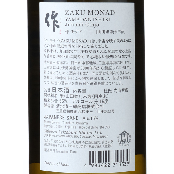 伊勢杜氏の伝統を引継ぎ、「味酒」を醸しています。鈴鹿山脈の清冽な伏流水は、酒造りに非常に適しており、伊勢平野は良質な米を我々に与えてくれました。1869年(明治二年)に若松村にて大黒屋清水清三郎商店として創業。若松は海に面しており港も近いために、かつては多くの醸造業が繁栄しましたが、現在では当社は鈴鹿市で唯一の蔵元となってしまいました。昔ながらの伊勢杜氏(農閑期の出稼ぎではない地元の杜氏による酒造り)の伝統を引き継ぎ、鈴鹿で生まれ育った杜氏が歴史史実に負けない「味酒」を精魂込めて醸しています。
