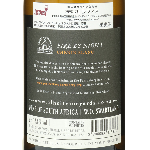 当主は若き天才醸造家であるクリス・アルヘイト氏で、彼は2011年に自身のファーストヴィンテージである「カルトロジー」をリリースするやいなや、瞬く間に国内で高い評価を受け、今最も注目を浴びる醸造家のひとりです。クリスとスザーン夫妻はワイナリー設立前に、世界中の様々なワイナリーを訪れた際に、それぞれの土地や地域ならではの表現力と個性のあるワイン造りに感銘を受け、自分たちの故郷であるケープ地方の土着の品種を用いて、南アフリカのアイデンティティーを表現したワイン造りをしたいと思うに至ったそうです。標高300メートル前後に位置し、海風や山おろしの吹く乾燥した区画に植えられているブドウの古木に出会い、この地で 『白ワインに特化したワイン醸造家になる 』 ことを目標に定め、ワイナリー設立に向け大きな一歩を踏み出しました。彼の造るワインには全て、彼がこだわり抜いた大地と風土、そして品種の魅力がそのまま大切に、丸ごとボトルに詰め込まれており、南アフリカの中の、西ケープ州における、銘醸地ヘルマナスの、またその区画ならではの個性がしっかりと表現されています。