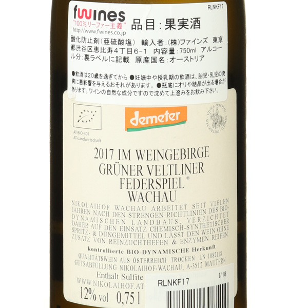 オーストリア原産の白ブドウ、グリュナー・フェルトリナーを100%使用。ビオディナミを実践し、辛口フルーティーな味わいに仕上げました。グレープフルーツやカリンなどの柑橘系果実と、白い花やスパイスの香りのあるバランスのよい味わいです。蔵紹介