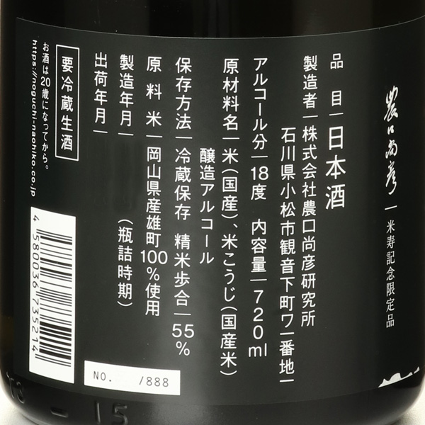 今期は農口尚彦杜氏にとって「米寿」、88歳を迎えた特別な年になります。この記念すべき年に農口杜氏の「酒造りにかける想い」「次世代にかける想い」を形として残すため、今期醸したお酒の中から5種類を選定し、それぞれ米寿にちなんで888本限定で、5回に渡りリリースします。シリーズ第3弾の今回は、岡山県産の雄町100%、精米歩合は55%の山廃造り、アルコール添加。なんと、農口尚彦研究所では「雄町」は初めてのリリースです!商品コンセプトは『身を粉にしても菌に合わせる。誤魔化そうなんて考えたら絶対に良い酒はできない。』ラベルには、麹を振るう農口杜氏の姿がデザインされています。シリアルナンバー付きです。