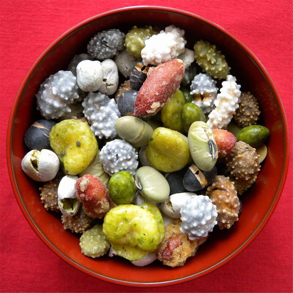 【原材料】砂糖、黒大豆(遺伝子組み換えでない)、落花生、青大豆(遺伝子組み換えでない)、エンドウ、そら豆、かぼちゃの種、小麦粉、澱粉、植物油脂、味噌(大豆を含む)、食塩、還元水飴、醤油(大豆・小麦を含む)、もち米粉、珈琲粉末、昆布エキス、抹茶粉末、クリームパウダー(乳成分を含め)、水飴、香料、青さ貝カルシウム、加工澱粉、クロレラ、調味料(アミノ酸)、レシチン(大豆由来)、酸化防止剤(ビタミンE,ビタミンC)