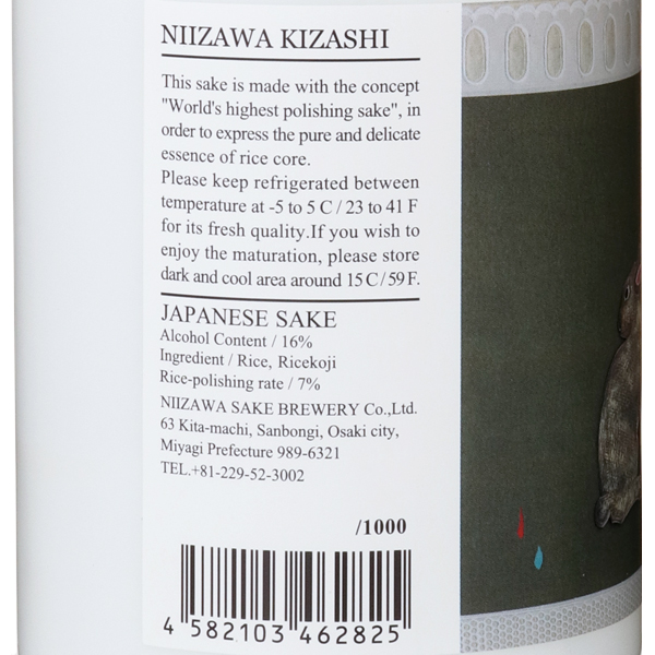 美術と日本酒のコラボレーション企画で誕生した商品です。契約栽培の宮城県産蔵の華を驚異の精米歩合7%まで磨き醸しました。NIIZAWAと残響の間の糖度で仕上げ、若さを感じる味わいです。お料理といただく食中酒としてはもちろんの事、じっくりと寝かせて熟成を楽しむのもおススメです。ラベルは期待の若手作家の作品から採用され、ビンテージ毎に変わります。コレクションにもオススメです。2021年ラベルエチケット