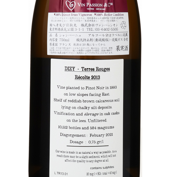 1993年植樹、ディジー村に所有する僅か1.35haの畑。東向きの緩やかな斜面下部にあり、白亜質のチョークの堆積層上に、石灰岩が混じる赤褐色の深い粘土土壌から、品質の高いピノ・ノワールが生み出されてきました。 2007年よりピノ・ノワール100%で主にセニエ方式で、ガストロノミックに寄り添うようなロゼを造り続けてきました。 2012年はシャンパーニュ史上最高とも言われる偉大な年ですが、収量が極めて少なく、セニエ式でロゼを仕込むことができなかったため、「Cuv?e n°740」のブレンド用にブラン・ド・ノワールとして造ったところ、これまでのロゼを超越するような素晴らしい出来になったことから、以降、ブラン・ド・ノワールを造っています。 ディジーの粘土の多いチョーク土壌の畑でオーガニック栽培を行うジャクソンの新たなブラン・ド・ノワールは、レッド・チェリーのような息を呑むほどに驚異的な長い余韻を持ちます。ピノ・ノワール100%。ドザージュ0.75g/L。2021年2月デゴルジュ。