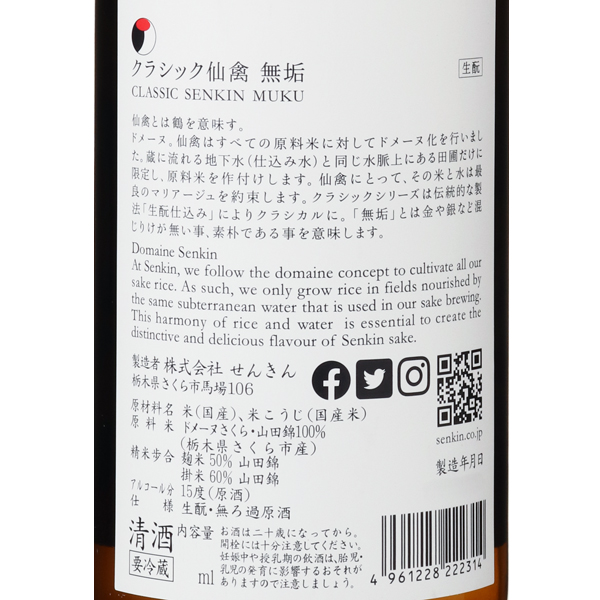 仙禽(せんきん)クラシックシリーズ:仙禽の酒質の特徴である酸味と甘味を上質に、控えめにまとめる。旨味主体の味わいの構成となり、香りはおだやか、味わいはスマートで旨味重視なため、総体的に一歩下がって料理をサポートする酒質。乳酸が主体のため、温度帯は常温付近で、和食や出汁中心の料理との相性が良い。日々を彩る、飾らない美しさ。けがれのない純真さを味わう、日常の幸福
