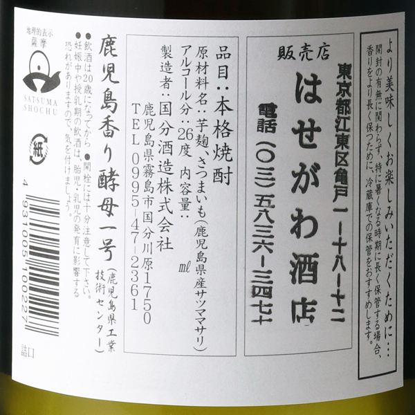 サツママサリを全量使用、白麹、酵母には鹿児島香り酵母1号を使い減圧で仕込んでいます。モノテルペンアルコール中のシトロネロール、ネロールが通常の10倍以上の数値になっており、この芳香成分により、柑橘系の香りが特徴のお酒に仕上がっています。注意事項