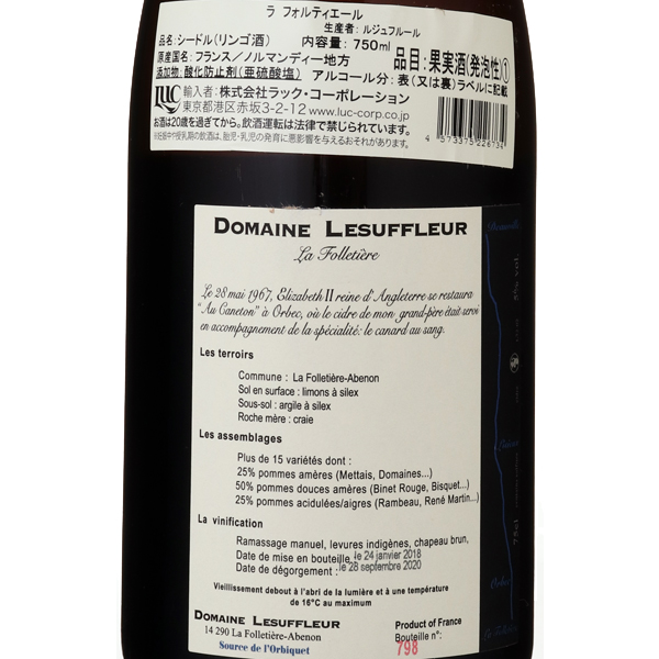 ラ・フォルティエールでは、ブノワの父の時代に植樹した15種類以上のリンゴを使用。ワインでいう村名的なキュヴェで、粘土質と石灰質の低木からなる単一畑。ルジュフルールのスタンダードキュヴェです。非常にクリーンなオレンジの色合いに、熟した桃やオレンジのアロマ、タンニンは多めで柔らかく、酸とミネラルも感じられ、柔らかい泡と優しい甘みが広がるミディアムな味わいです。パリのアルページュなど三つ星はじめガストロノミックなレストランで採用され、ワインショップでは手に入らないシードルになっています。アルコール度数は5%。シードルの枠を超えるほどのクオリティで、香り、味わい共に非常に豊かで複雑な味わいです。