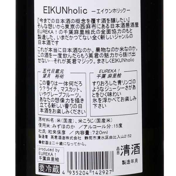 「今までの日本酒の概念を覆す酒を醸したい」そんな想いから英君と東京西麻布の日本酒酒場 EUREKA!の店主 千葉真里絵氏とコラボレーション商品。酒米みずほのかを、静岡酵母HD-101で醸しました。米由来の香り成分、4MMPによるマスカットやライチを思わせる爽やかで清涼感ある香りが広がります。4MMPとは、白ワインの品種ソーヴィニョン・ブランから検出される香りの成分で、新しい清酒の香りとして近年注目されています。甘みと酸味の良いバランスでスッキリとしたお酒です。この香りにハマって、英君から抜け出せなくなってしまう!?「EIKUNholic」をぜひお楽しみください。
