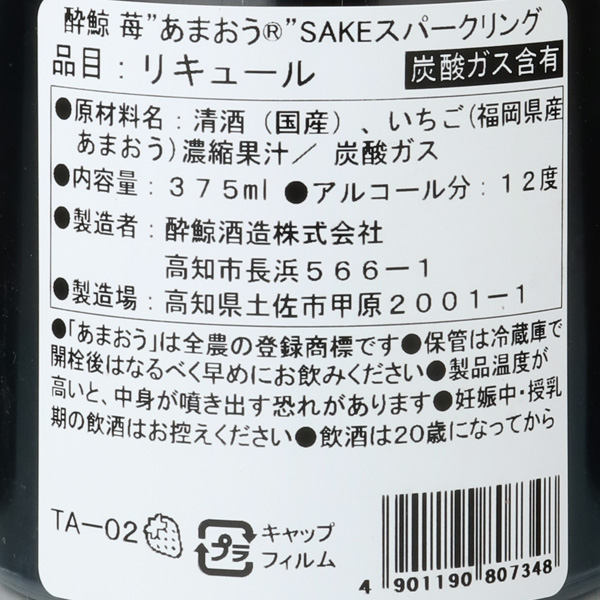 藤巻百貨店と酔鯨酒造が共同開発した、大人な苺の日本酒スパークリングリキュール。甘酸っぱく濃厚な味わいが特徴の福岡県を代表するブランド苺「あまおう」と、上質な吟醸香と切れ味にこだわった「酔鯨の純米大吟醸」をマッチさせ、炭酸でスッキリまとめた日本酒ベースのスパークリングリキュールです。注意事項
