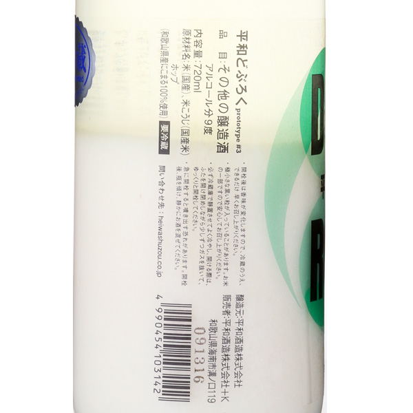 平和どぶろく 第三弾は平和クラフトで使用しているホップのフレーバーを表現する事に挑戦しました。和歌山県米 にこまるのまろやかさと、ホップの香りを楽しみながらごくごく飲めるdrinkableなお酒を目指しました。これまでで最も軽めのテイストに仕上げています。口に含むとやわらかな食感を残した米の甘味、鼻に抜けるジューシーなホップの香りが感じられ、後味はほのかな苦味、酸味ですっきり爽やか。ぷちぷちと舌に感じられる炭酸が飲みやすさをさらに引き立てる軽やかな一本です。蔵紹介
