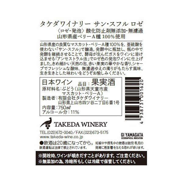 山形県産の良質なマスカット・ベリーA種を100%使用し、亜硫酸を使用しない「サン・スフル」で醸造を行いました。発酵中のワインを瓶詰めし、瓶の中で発酵を継続させることで、酵母が生んだガスをワインに溶け込ませるアンセストラル法を用いています。天然のきめ細やかな泡が、ベリーAの赤い果実の華やかな香りを引き立て、シャープでフレッシュな酸味が爽やかな発泡ロゼワインです。また、ろ過をしないで瓶詰めすることでぶどう由来の濁りが残り、それが風味となっています。酸化防止剤を使用せず、ろ過も行わない素直な味わいと、1本1本それぞれの瓶の中で育まれた、生き生きとした味わいをどうぞお楽しみください。