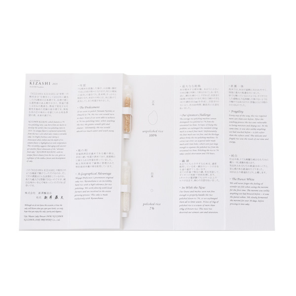 現代アートとのコラボレーション日本酒として2015年に発売。以来、毎年様々なアーティストとのコラボレーションしています。高度精米になると麹の製造が極端に難しくなり、麹由来の旨味を引き出しにくくなるのですが、KIZASHIについては、同じ7%精米である『残響Super7』の1.5倍程度の米の旨味を引き出すことに成功した、技術溢れる1本となっています。『NIIZAWA 純米大吟醸』と『残響Super7』の間の糖度で仕上げており、若さを感じる酒質です。冷蔵庫で保管することにより、綺麗に熟成していきます。年間1000本限定の貴重な1本です。