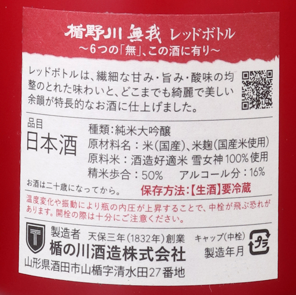 楯野川の生酒を楽しめるのが無我シリーズです。無我はただの生酒ではなく、6つの「無」をコンセプトとして造られています。採れたそのままの(無濾過)、濃厚な旨味を持つ原酒で(無加水)、フレッシュな生酒として(無加熱)、自然な発泡感を残したまま(泡を立てない充填)、上槽当日に瓶詰め(時間を置かない)しました。新鮮味あふれる美味しさを無我夢中に追求した新しい形の日本酒です。蔵元の亀口から汲んで飲む、あの美味しさを体験ください。シリーズ第3弾の「レッドボトル」は、山形県が誇る最高峰の酒米「雪女神」を100%使用しています。繊細な味わいと、どこまでも綺麗で美しい余韻が口の中に広がります。ボトルは「女神」をイメージした「レッド」で、雪女神らしい上品でしなやかな味わいとそれでいてキリっとした旨みを表現しています。