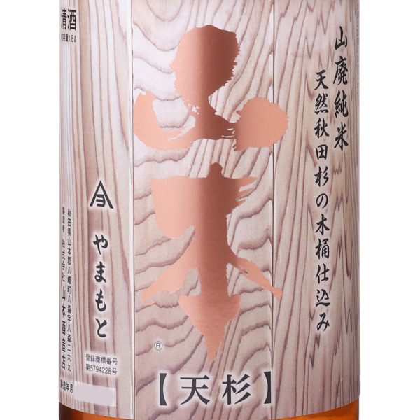 現在では伐採が禁止されている天然の秋田杉、樹齢200年を超える天然の秋田杉(天杉)で作られた木桶で仕込んだ山廃純米の生原酒です。天然の秋田杉は年輪の幅が狭く、収縮が少ないため耐久性に優れており、色鮮やかな美しい木目に特徴があります。その美しさを伝えるため、木桶の表面を撮影しそのままラベルの背景に使用。このラベルを眺めながら、樹齢200年の天杉に想いを馳せる、そんな飲み方が似合う一本です。火入と違い生原酒のフレッシュでより力強い味わいをお楽しみください。