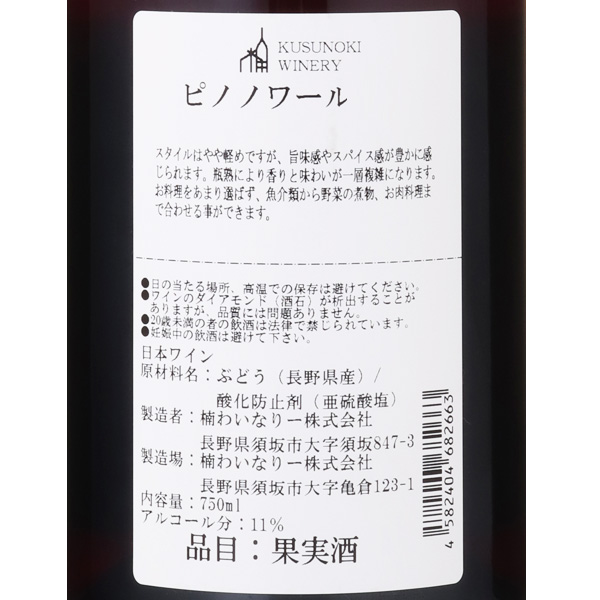 楠わいなりーの名前を広く知って頂くきっかけとなった品種がこのピノ・ノワールです。楠わいなりーのピノの特徴である旨味やスパイス感が豊かに感じられる、エレガントなワインです。瓶熟により香りと味わいが一層複雑になります。お料理をあまり選ばず、魚介類から野菜の煮物、お肉料理まで合わせることができます。蔵紹介