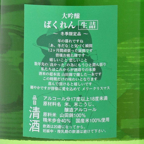 大人気銘柄 「ばくれん吟醸」の姉妹品、「サンタクロースばくれん大吟醸」が今年も登場!山田錦を40%まで磨いた大吟醸スペック。サンタクロース姿にケーキとグラスを持っている浮世絵のラベルは、蔵元のあそび心が満載!くどき上手らしいジューシーで上品な香りと、優しいお米の甘味。ばくれんの特徴であるシャープな後口をお楽しみください。