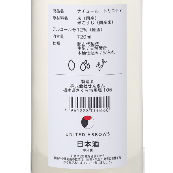 仙禽の伝統的な技術をベースに、革新的な挑戦をする姿に感銘を受けたユナイテッドアローズが酒造りにも参加する中で2020年に生まれたコレクション。UAコレクションでは初のナチュール『UAナチュール・トリニティ』。仙禽オーガニック・ナチュールをベースに徹底的に酸を追求した自然派日本酒です。米、米麹、水のみで造られるナチュール。トリニティとは三重、三位一体を意味します。柑橘系の果実をかじった様なはっきりとした酸味に上品な甘味が融合し、際立った個性がありながらも軽くクリアに仕上げました。また、白麹を使用する事で甘味と酸の理想的なバランスを形にしています。たった3つの原料から生み出される仙禽の哲学が凝縮した新たな味わいをお楽しみください。