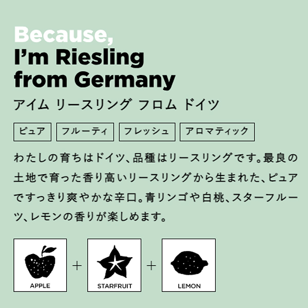 すっきりさわやか、気高い香りわたしの育ちはドイツ、品種はリースリングです。最良の土地で育った香り高いリースリングから生まれた、ピュアですっきり爽やかな辛口。青リンゴや白桃、スターフルーツ、レモンの香りが楽しめます。