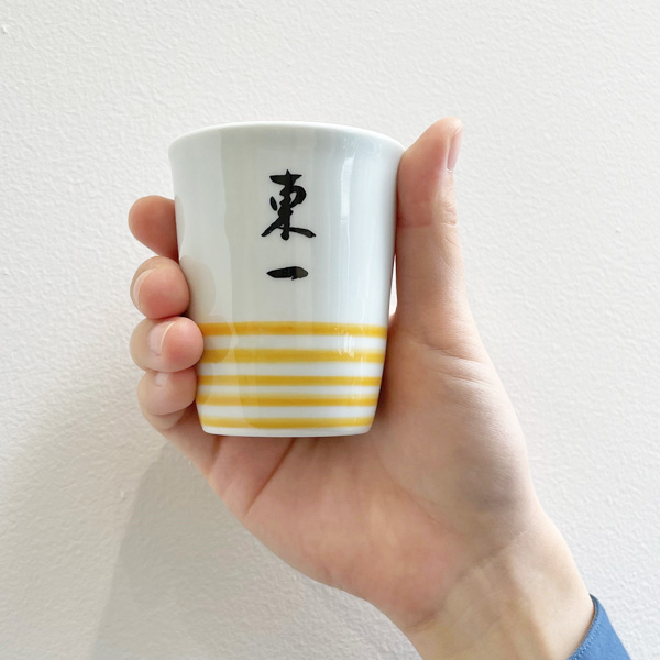 佐賀県の代表的なやきもの・有田焼と同様、400年の歴史を誇る肥前吉田焼でつくられた「東一」ロゴ入りぐい呑みです。線はすべて手描きのため、色の濃淡や太さが少しづつ異なり、そこに手作りならではの親しみやすさが感じられます。