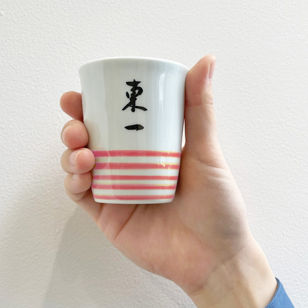 佐賀県の代表的なやきもの・有田焼と同様、400年の歴史を誇る肥前吉田焼でつくられた「東一」ロゴ入りぐい呑みです。線はすべて手描きのため、色の濃淡や太さが少しづつ異なり、そこに手作りならではのやさしさや親しみやすさが感じられます。サイズ:口径6.5mm × 高さ8mm
