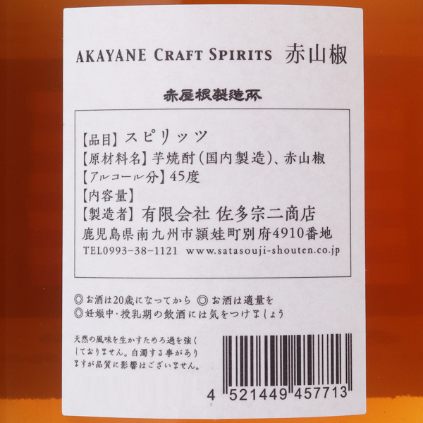 AKAYANE CRAFT SPIRITS 赤山椒 45度 / 佐多宗二商店