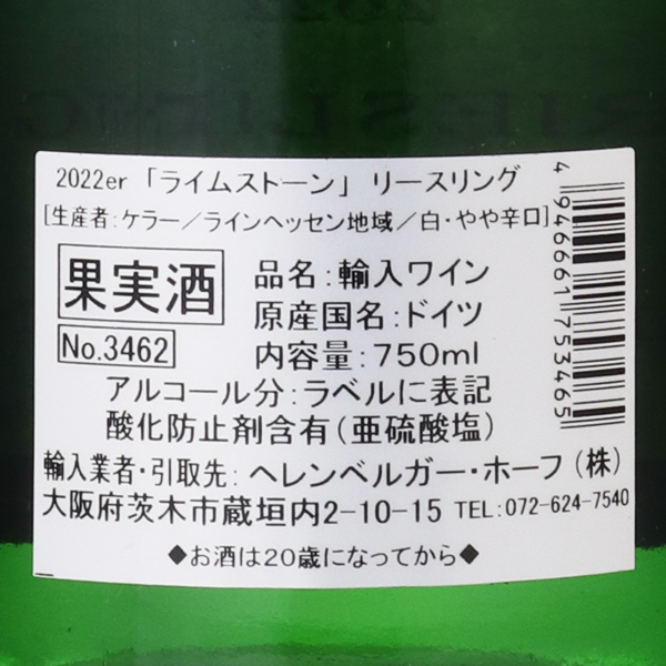 【SALE】ライムストーン リースリング ミディアムドライ 2022 / ケラー