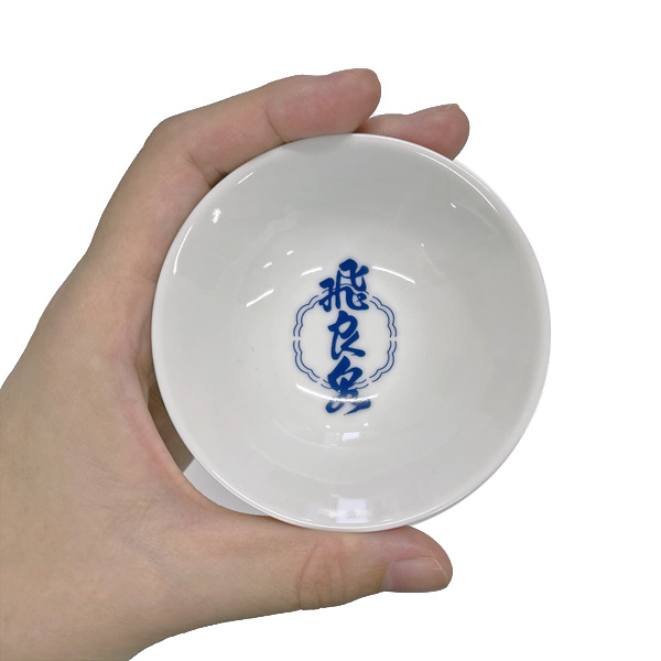 「飛良泉」のロゴ入り平盃です。口径が開いているので、香りが広がり穏やかな味わいが楽しめます。注いで浮き出た飛良泉のロゴが、お酒をキリッと引き締めます。