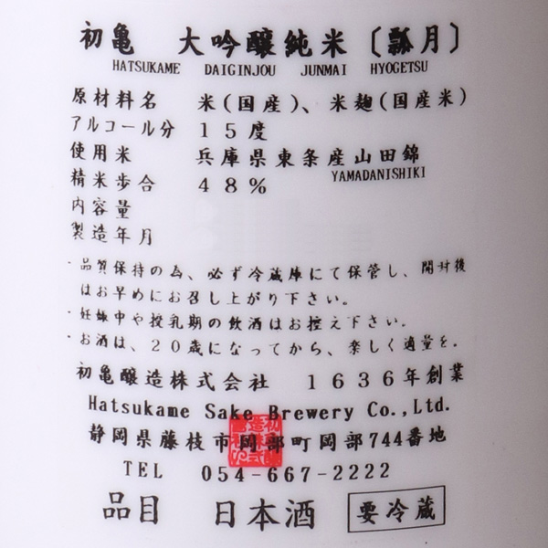 初亀瓢月は地元岡部町の茶室、瓢月亭より命名。玉露を育てる心と酒を育てる心は通じ合い、初亀の酒造りの原点でもあります。兵庫県東条町産の山田錦を全量使用し、50%まで磨き醸した純米大吟醸です。華やかで上品な吟醸香と繊細で柔らかな味わいが魅力。程よい酸のキレが後口を軽やかに引き締め、綺麗な余韻を残します。蔵紹介