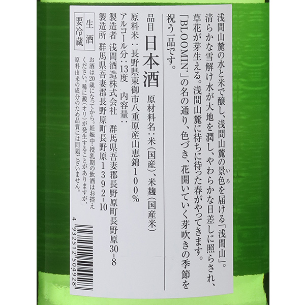 浅間山麓の水と米で醸し、浅間山麓の景色を届ける「浅間山」。清らかな雪解け水が大地を潤し、やわらかな日差しに照らされ、草花が芽生える。浅間山麓に町に待った春がやってきます。「BLOOMIN'」の名の通り、色づき、花開いていく芽吹きの季節を祝う一品です。BLOOMIN'=BLOOMING:開花