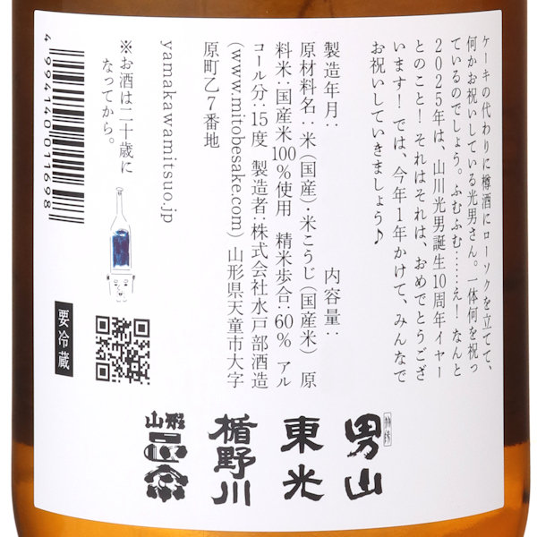 祝!10周年山形県の有志4蔵が合同で酒造りを行うプロジェクト「山川光男」。今年は光男さん10 歳、もとい、山川光男10 周年のアニバーサリーイヤーです♪これからも気合いを入れることなく、面白いことをマイペースで追い求めていくそうです。爽やかなマスカットの香りと軽快な酸が際立つフルーティな味わいです。スッキリした飲み口でキレ良くフレッシュな仕上がりになっています。