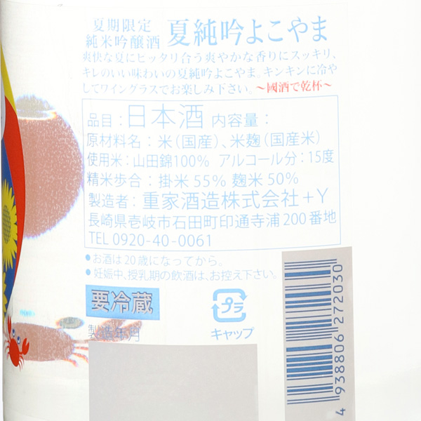 真夏の壱岐のビーチをイメージさせるヤシの木にハイビスカス、ビーチボールとカラフルなラベルが目を引くよこやまの夏酒!最高峰の山田錦のお米を使用し、爽快な夏にピッタリ合う爽やかな香りに、スッキリ切れの良い味わいの純米吟醸です。アジの南蛮付けや夏野菜のディップの料理など抜群に合います。5℃以下に冷やしてワイングラスでお楽しみ下さい。注意事項